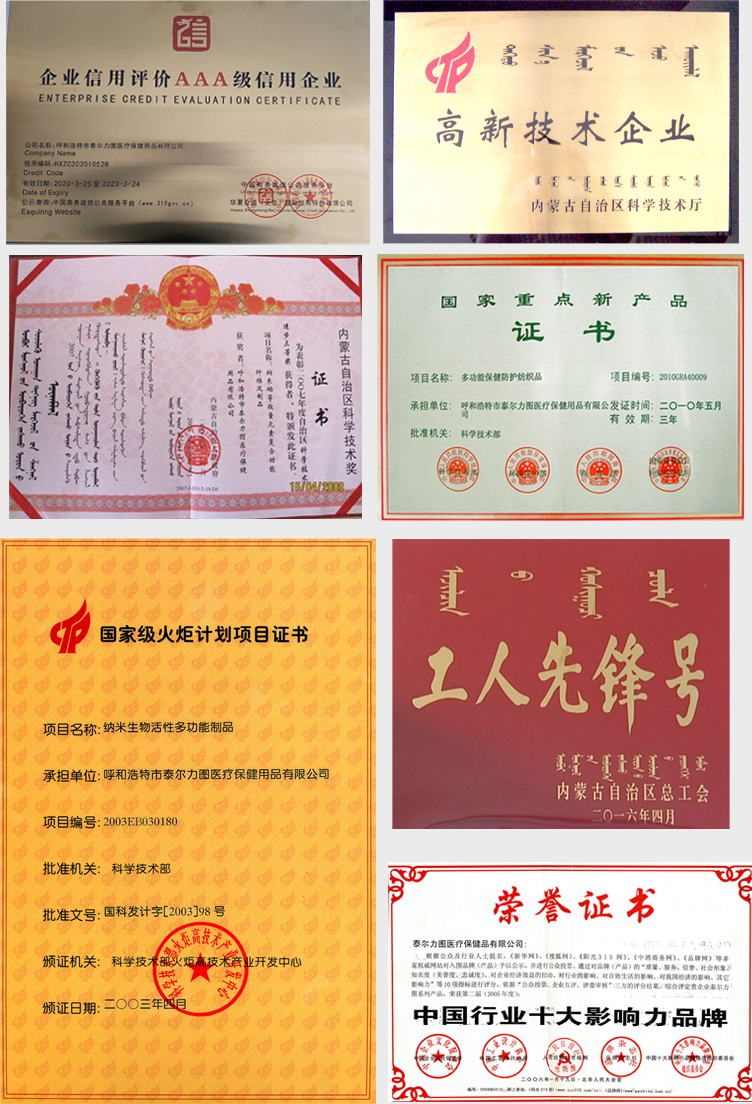泰爾力圖公司不斷開(kāi)拓創(chuàng)新,銳意進(jìn)取,在技術(shù)創(chuàng)新的進(jìn)程中不斷取得重大突破,憑借卓越的產(chǎn)品品質(zhì),顯著的功能作用,和良好的市場(chǎng)美譽(yù)度,贏得了廣大消費(fèi)者的認(rèn)可和廣泛贊譽(yù)。“納米生物活性多功能健康制品”被列為《國(guó)家級(jí)火炬計(jì)劃項(xiàng)目》,被國(guó)家四部委聯(lián)合認(rèn)定為《國(guó)家重點(diǎn)新產(chǎn)品》,并在第十八屆中國(guó)國(guó)際高新技術(shù)成果交易會(huì)榮獲同行業(yè)唯一的《優(yōu)秀產(chǎn)品獎(jiǎng)》和《第五屆中國(guó)國(guó)際發(fā)明展覽會(huì)銀獎(jiǎng)》,并榮獲內(nèi)蒙古自治區(qū)《科技進(jìn)步三等獎(jiǎng)》,呼和浩特市《科技進(jìn)步一等獎(jiǎng)》。“泰爾力圖”品牌先后獲得《中國(guó)行業(yè)十大影響力品牌》、《中國(guó)質(zhì)量服務(wù)信譽(yù)AAA級(jí)企業(yè)》、《中國(guó)保健精品知名品牌》、等榮譽(yù),連續(xù)15年被認(rèn)定為《內(nèi)蒙古自治區(qū)著名商標(biāo)》,“泰爾力圖納米生物活性抗菌材料創(chuàng)新創(chuàng)業(yè)人才團(tuán)隊(duì)”在2016年被內(nèi)蒙古自治區(qū)組織部評(píng)為《草原英才創(chuàng)新創(chuàng)業(yè)團(tuán)隊(duì)》;被內(nèi)蒙古總工會(huì)授予《工人先鋒號(hào)》榮譽(yù)稱(chēng)號(hào)。諸多榮譽(yù)奠定了泰爾力圖醫(yī)療保健用品有限公司在納米健康產(chǎn)業(yè)的領(lǐng)先地位。