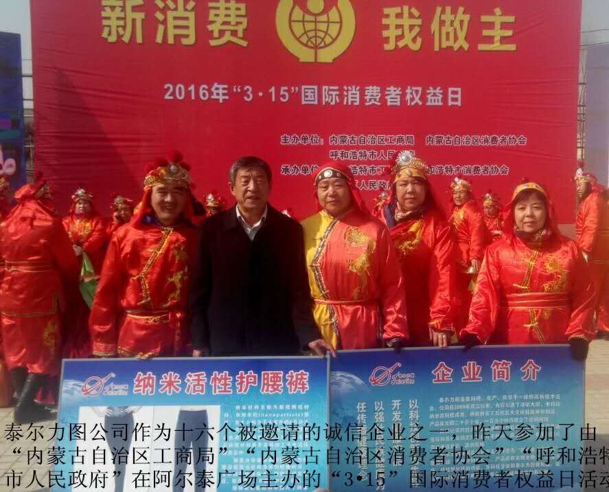 泰爾力圖公司受邀參加由工商局,呼市政府等多家單位舉辦的3.15國際消費(fèi)者權(quán)益日活動,泰爾力圖法人張瑞先生出席活動,感謝新老客戶多年來對泰爾力圖保健產(chǎn)品的支持與信任,我們會再接再厲,選擇我們,您不會后悔!內(nèi)蒙古呼和浩特市泰爾力圖醫(yī)療保健用品有限公司 固 話: 0471-5684131 0471-5684228 QQ號碼: 1912803055 網(wǎng) 址:www.e16ee.cn/泰爾力圖.com 地 址: 呼和浩特市玉泉區(qū)裕隆工業(yè)園C區(qū)3號